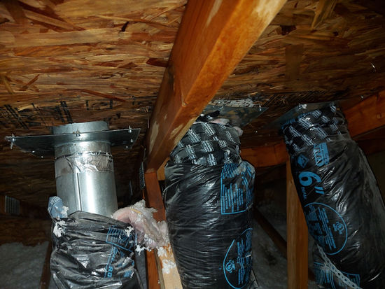 Due to the significant moisture and ice buildup, the insulation within the exhaust hoses is currently saturated. To ensure proper ventilation and prevent future moisture issues, it is strongly recommended that the exhaust hoses be replaced along with the gooseneck vents and flanges.