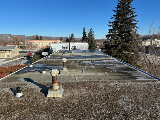 The subject roof is a gray, torch-applied SBS modified bitumen system, penetrated by two plumbing vents and one furnace B-vent. Adjoining this roof to the north is another roof utilizing the same gray SBS torch-on material. Conversely, the roof to the south is a built-up roofing (BUR) system covered with pea gravel ballast. Notably, a spudded seam is evident, suggesting a previous effort to connect the current SBS system to the existing BUR system."
